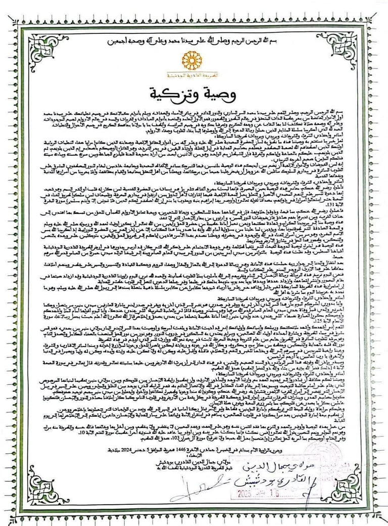 وفي هذا السياق، تأتي أهمية الوصية الروحية (أو الإذن) التي تُعطى لمن بلغ مقام التربية، فهي ليست وراثة نسبية بل وراثة سرٍّ وتزكية واستعداد. ومن هذا الباب، يحمل بشارة العارفين الدكتور مولاي منير القادري بودشيش حفظه الله وصية تزكية وإجازة تربوية من والده الشيخ المربي سيدي جمال الدين قدّس الله سره، وهي وصية تؤكِّد انتقال السلوك ومعاني التزكية بسند متّصل أصيل.